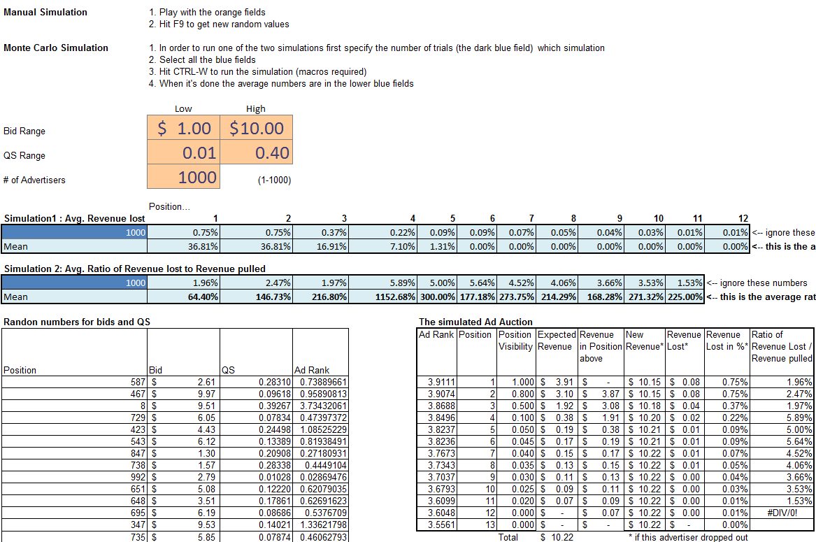 Now we have everything that we need in order to simulate an auction and calculate Google’s revenue. Excel’s random numbers generator gets us some bids and quality scores and we calculate the rest. The following table was generated with random bids from $1 to $10 and quality scores between 0.05 and 0.40: