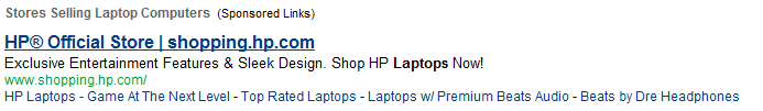 This one comes from a product page for a MacBook Air Laptop. Again, headlines are bolded, but nothing else gets promoted to extend a headline. Both description lines make up one long description, so there is no need to end a sentence after the first line. Keywords are bolded within the description and the display URL. For more attention one can simply put the product name into the ad: