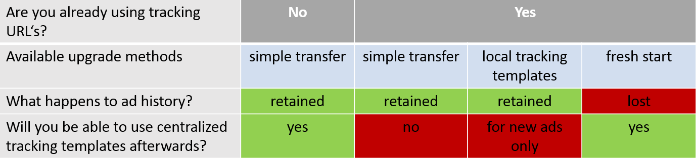 Depending on whether you already use tracking URL’s there are different upgrade methods available: