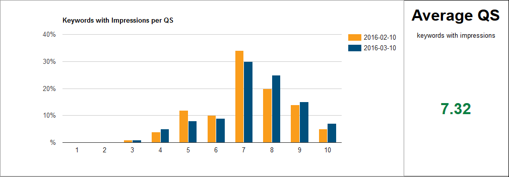 I was wondering if you had any plans of integrating cost weighted QS? As it is now with impression/click weighted QS, these might be giving you the wrong impression because of branded searches. If search volume for your brand name goes up (or you up your impression share) than your impressions & clicks for branded keywords might get a lot more volume compared to generic keywords, and make your impression/click weighted QS go up. Yet, excluding your branded campaigns, the evolution might well be the other way around.