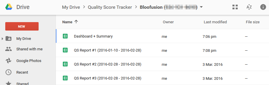 All files (dashboard and tracked keyword Quality Scores) are stored in a folder in your Google Drive. You can access them through your browser, or use all of the Google Drive features, like synchronizing the folder with your device, or sharing folders with others.