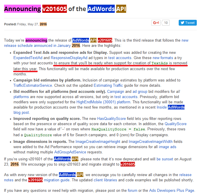 Last week, Google announced v201605 of the AdWords API. The highlights included an interesting part about Expanded Text Ads โ until it was removed from the announcement.