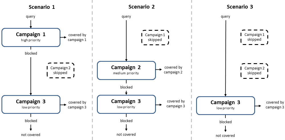 For example, if the second campaign has a mobile bid modifier of -100 %, it will only catch queries from desktop and tablet devices. So if the other campaigns cover all devices, mobile queries will have to skip the second campaign (as depicted above in scenarioĀ 1). As a result, all queries that would otherwise have been caught by the first campaign, will end up in the second one.