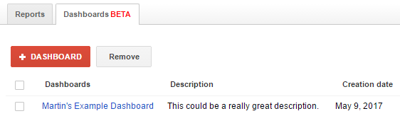 The new dashboard feature is based on the report editor. In case you have access, you’ll see a new tab “Dashboards BETA”. There you can add new dashboards and access saved ones: