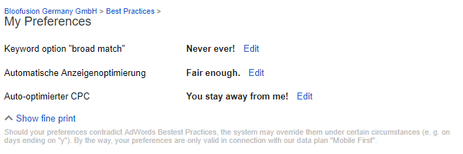 The solution that Google has come up with is a classic compromise. Advertisers will be able to overwrite default settings at the account level, even disabling unwelcome recommendations. AdWords will then no longer bother the user and in return won’t bother with the user’s preferences.