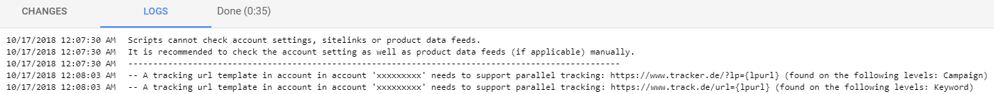 Our script goes through one or more accounts and checks the tracking templates of campaigns, ad groups, ads, and targeting criteria (like keywords). In case it finds a template that needs to support parallel tracking, it makes a note in the script’s logs. That’s all the script does.
