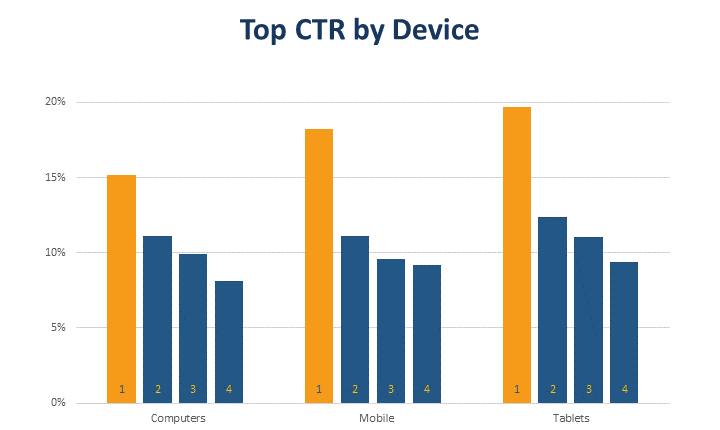 Another thing to consider is that Google doesn’t always show ads on all four top positions. However, our data suggests that these positions are more often filled on desktop computers and less often on tablets or mobile devices. This would support the conclusion above.